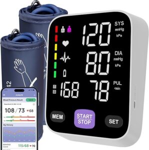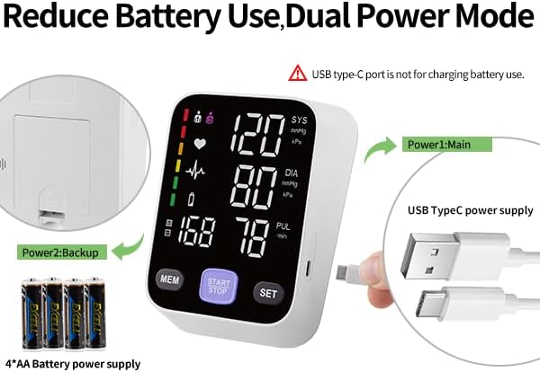 Conception à un seul bouton : Ce tensiomètre Oklar est doté d’un fonctionnement à un seul bouton, pour une mesure simple et pratique. D’une simple pression, vous pouvez prendre une mesure rapidement et obtenir une mesure précise. Grand écran LED : L’écran LED rétroéclairé aux chiffres clairs permet une lecture rapide et facile. Vous pouvez obtenir des mesures en 1 minute, et il est convivial pour les personnes âgées. Enregistrement jusqu’à 240 mesures : Prend en charge deux utilisateurs, avec une capacité de stockage de 120 mesures par utilisateur. Cette fonctionnalité facilite le suivi et la surveillance de l’évolution de votre tension artérielle pour vous et votre famille au fil du temps. Double alimentation pratique : Fonctionne avec 3 piles AA ou une interface Type-C (Remarque : utilisez le câble Type-C fourni si aucune pile n’est installée ; ce produit n’est pas rechargeable). Sa taille compacte et sa double alimentation garantissent une utilisation à domicile ou en déplacement. Brassard réglable : La taille du brassard, de 22 à 40 cm (8,7 à 15,7 pouces), s’adapte à votre taille, garantissant un maintien